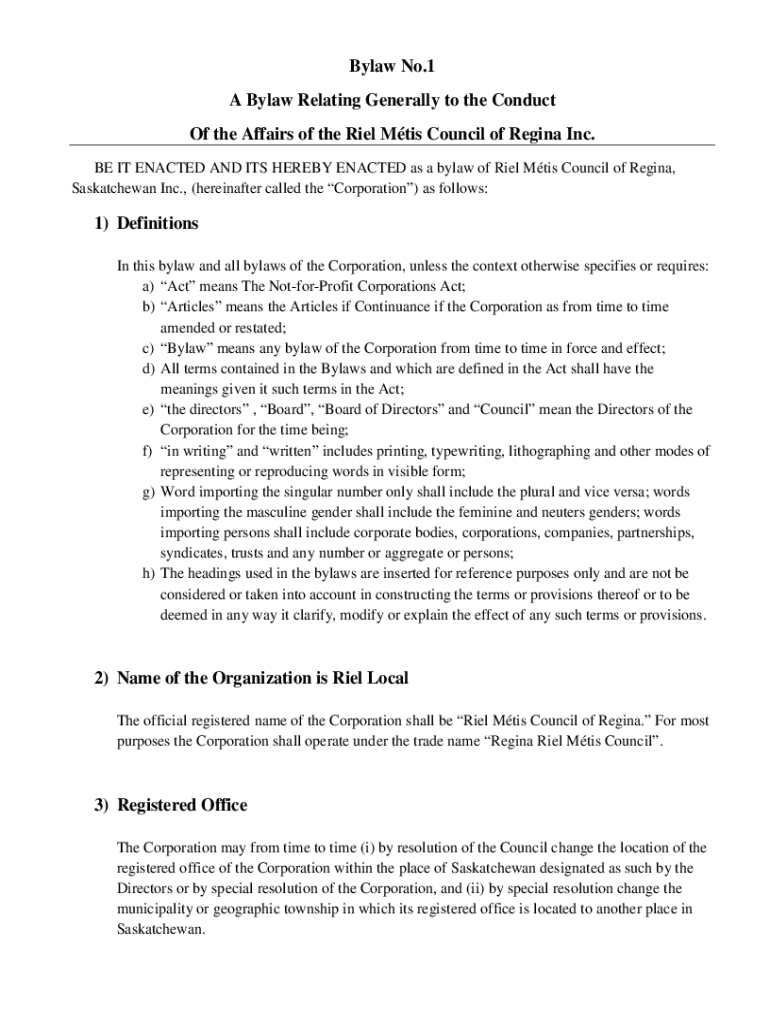 To fill out Bylaw No. 1, follow the provided templates or guidelines, ensuring to include necessary details such as organizational structure, duties of officers, and procedures for meetings.
