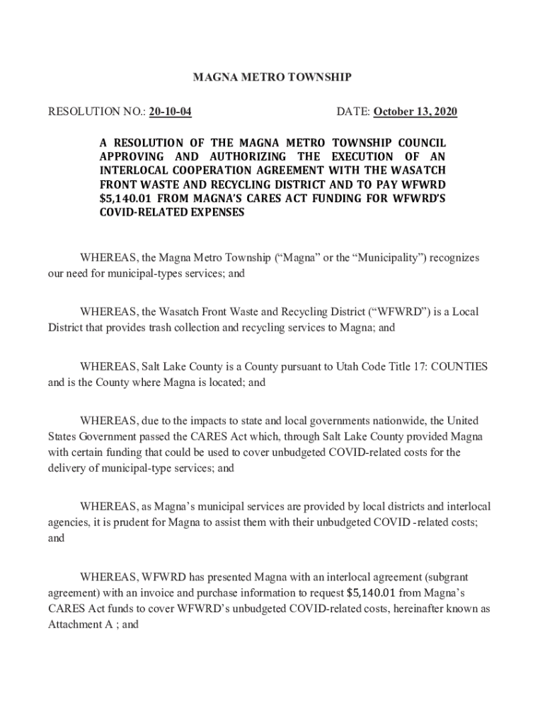 MAGNA METRO TOWNSHIP RESOLUTION NO.: 201004DATE: October 13, 2020A RESOLUTION OF THE MAGNA METRO TOWNSHIP COUNCIL APPROVING AND AUTHORIZING THE EXECUTION OF AN INTERLOCAL COOPERATION AGREEMENT WITH