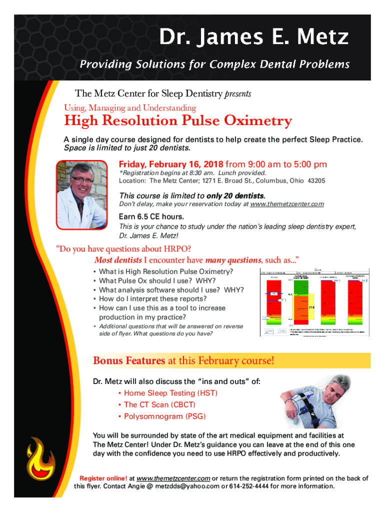 The Metz Center for Sleep Dentistry presents Using, Managing and UnderstandingHigh Resolution Pulse Oximetry A single day course designed for dentists to help create the perfect Sleep Practice. Space