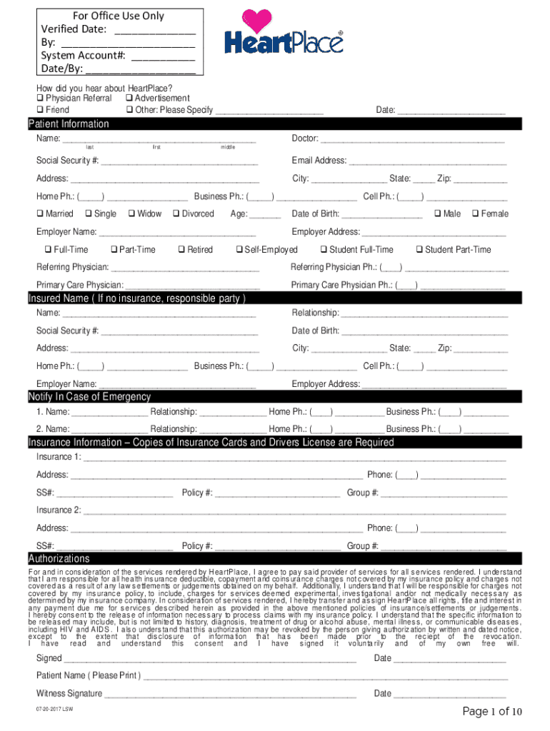 For Office Use Only Verified Date: ___ By: ___ System Account#: ___ Date/By: ___ How did you hear about HeartPlace? Physician Referral Advertisement Friend Other: Please Specify ___Date: ___Patient