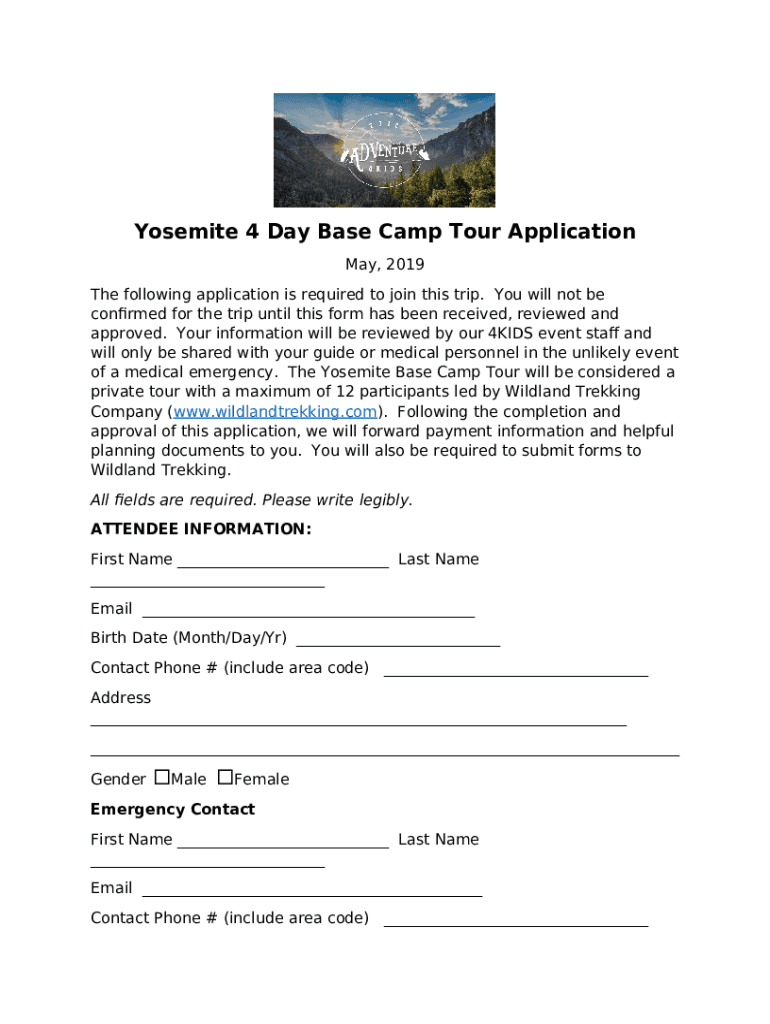 Instructions for the Yosemite 4 Day Base Camp Tour Application form