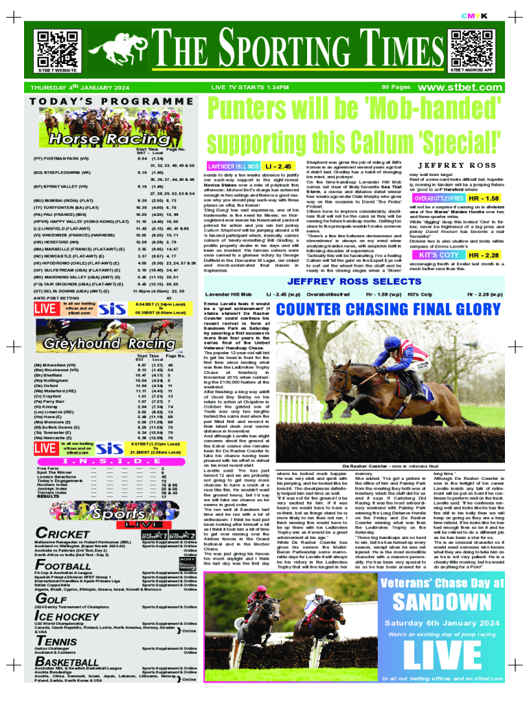 The Sporting Timesheet WebSiTeTHURSDAy 4th January 2024TODAYS PROGRAMMEStart Times Local(PP) PORTMAN PARK (VR)8.04Page No.(1.34)