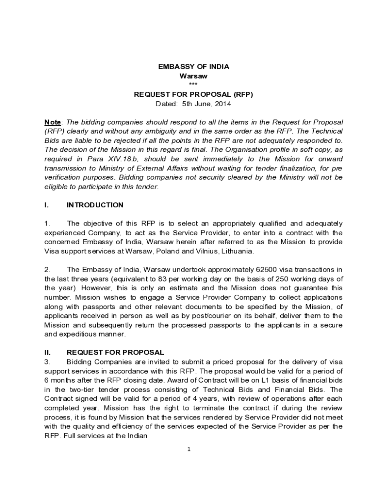EMBASSY OF INDIA Warsaw *** REQUEST FOR PROPOSAL (RFP) Dated: 5th June 2014 Note: The bidding companies should respond to all the items in the Request for Proposal (RFP) clearly and without any ambiguity