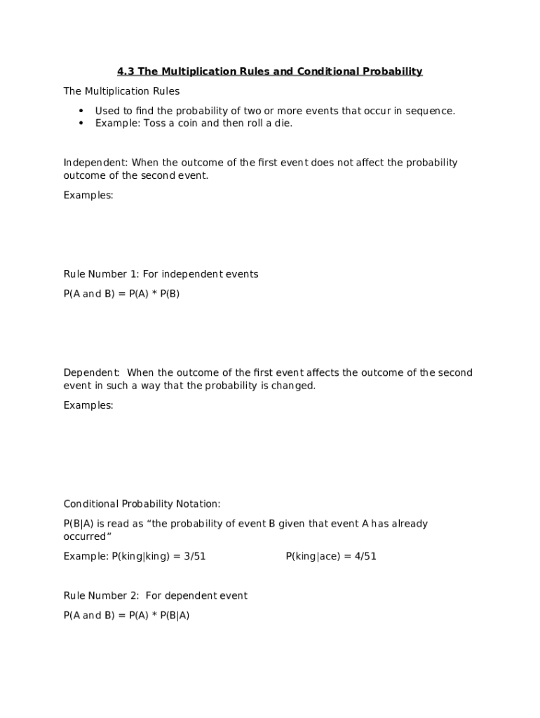 The Solved Section 4.3: The Multiplication Rules and Conditional is a Word document that can be filled-out and signed for certain purposes. In that case, it is furnished to the actual addressee to provide specific info of certain kinds. The completion and signing is able manually in hard copy or using a suitable service like PDFfiller. Such services help to send in any PDF or Word file online. It also allows you to customize it for your needs and put a legal e-signature. Once done, the user ought to send the Solved Section 4.3: The Multiplication Rules and Conditional to the recipient or several recipients by mail and also fax. PDFfiller includes a feature and options that make your blank printable. It includes a variety of options when printing out appearance. It does no matter how you distribute a form - in hard copy or by email - it will always look professional and organized. In order not to create a new writable document from scratch every time, make the original Word file as a template. Later, you will have an editable sample.