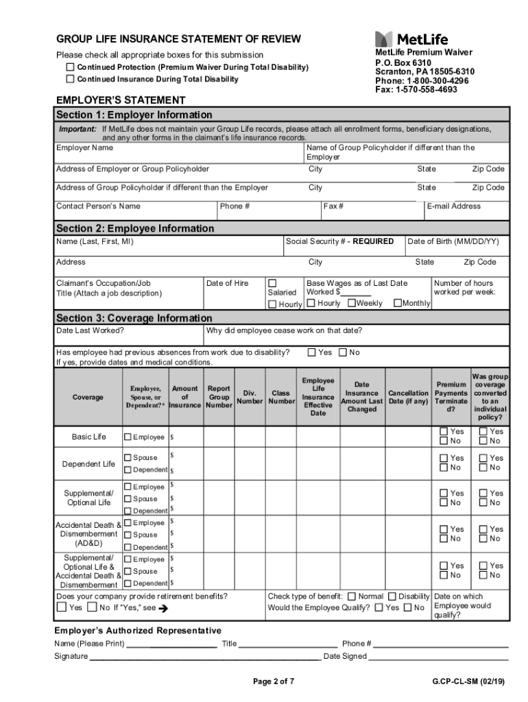 MetLife Premium Waiver P.O. Box 6310 Scranton, PA 185056310 Phone: 18003004296 Fax: 15705584693Metropolitan Life Insurance CompanyDear Employer and Employee/Member: the attached forms should be completed