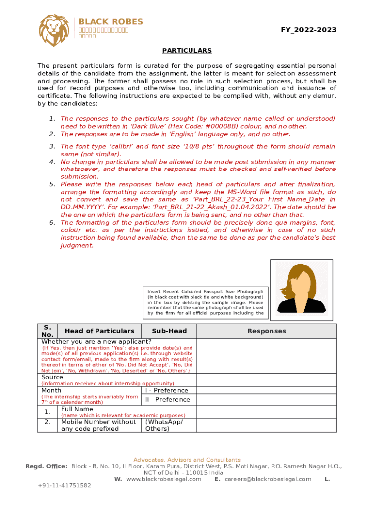 Instructions for the form The present particulars is curated for the purpose of segregating essential personal details of the candidate from the assignment, the latter is meant for selection assessment and processing