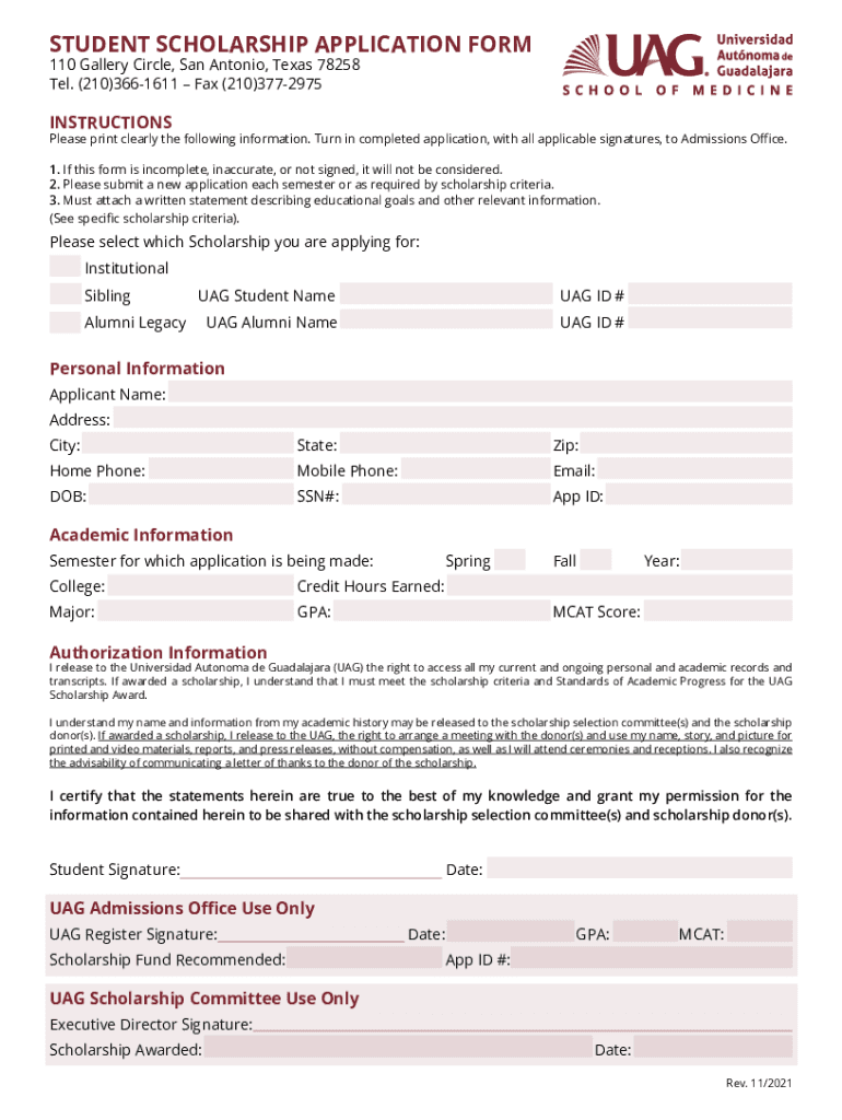 STUDENT SCHOLARSHIP APPLICATION FORM 110 Gallery Circle, San Antonio, Texas 78258 Tel. (210)3661611 Fax (210)3772975INSTRUCTIONSPlease print clearly the following information. Turn in completed application,
