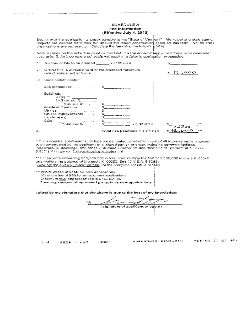 _ .. _......SCHEDULE AFee InffJnnation(Effective .July 1, 2010)S;;brr:i: with the application a check payabie 10 lr:e \"State of Vecrr\'. Mun:cip,:t\' and state a;)cncj projects are exempt frcm fees