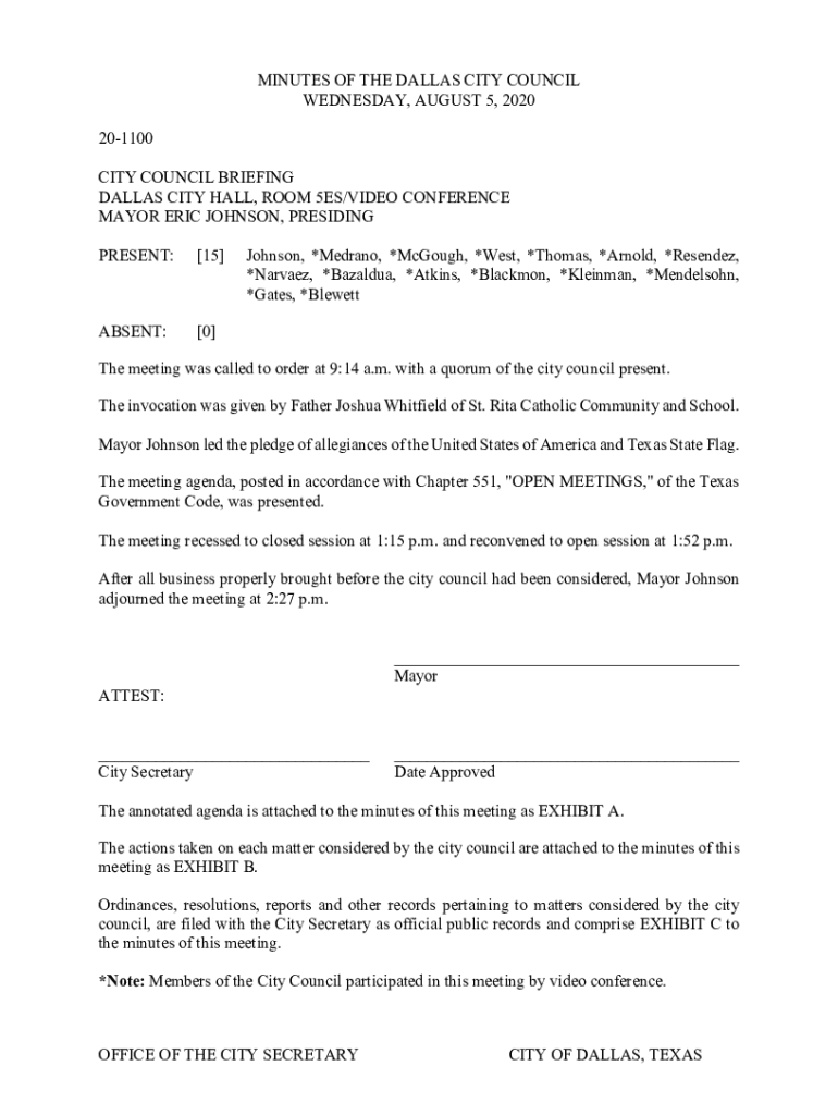 MINUTES OF THE DALLAS CITY COUNCIL WEDNESDAY, AUGUST 5, 2020 201100 CITY COUNCIL BRIEFING DALLAS CITY HALL, ROOM 5ES/VIDEO CONFERENCE MAYOR ERIC JOHNSON, PRESIDING PRESENT:[15]ABSENT:[0]Johnson, *Medrano,