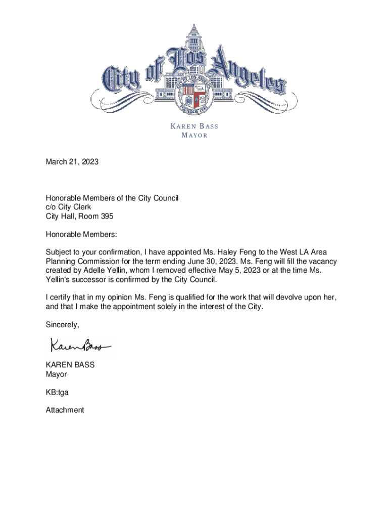 KAREN BASS MAYORMarch 21, 2023Honorable Members of the City Council c/o City Clerk City Hall, Room 395 Honorable Members: Subject to your confirmation, I have appointed Ms. Haley Feng to the West