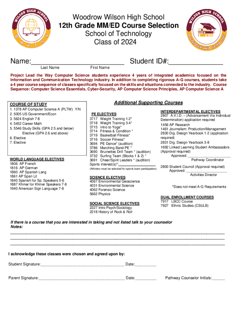 Get the free Woodrow Wilson High School 12th Grade MM/ED Course ...