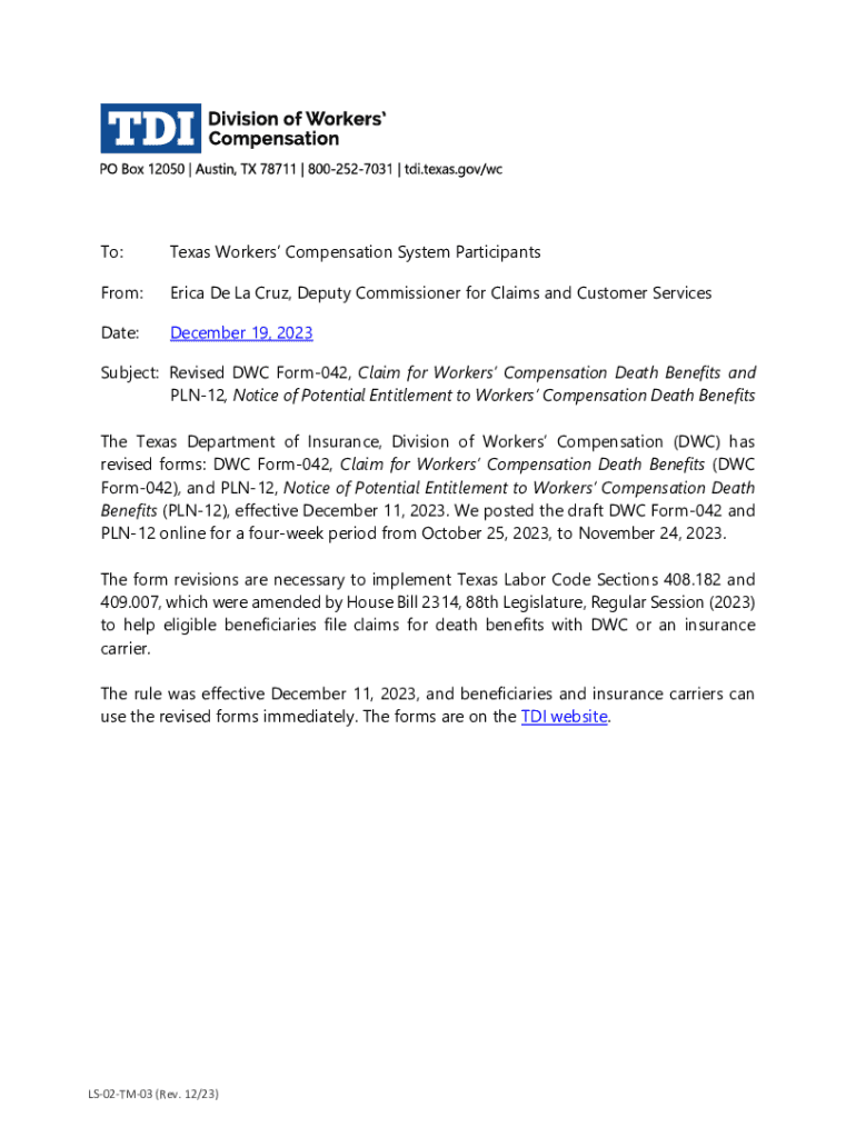 To:Texas Workers Compensation System ParticipantsFrom:Erica De La Cruz, Deputy Commissioner for Claims and Customer ServicesDate:December 19, 2023Subject: Revised DWC Form042, Claim for Workers Compensation