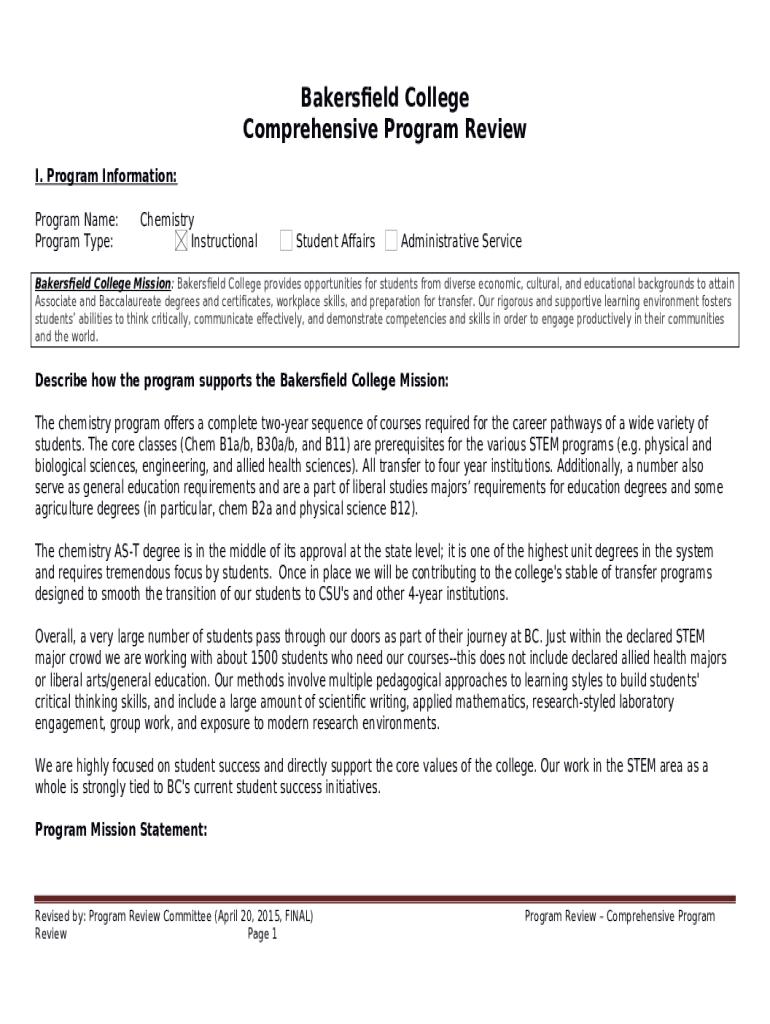 The Program Name:Chemistry is a fillable form in MS Word extension needed to be submitted to the required address to provide specific info. It must be filled-out and signed, which may be done manually, or with the help of a particular solution such as PDFfiller. This tool helps to fill out any PDF or Word document right in the web, customize it depending on your purposes and put a legally-binding electronic signature. Right after completion, you can send the Program Name:Chemistry to the appropriate receiver, or multiple individuals via email or fax. The template is printable as well due to PDFfiller feature and options offered for printing out adjustment. In both electronic and physical appearance, your form will have a clean and professional look. Also you can save it as the template to use it later, so you don't need to create a new document from the beginning. You need just to amend the ready form.