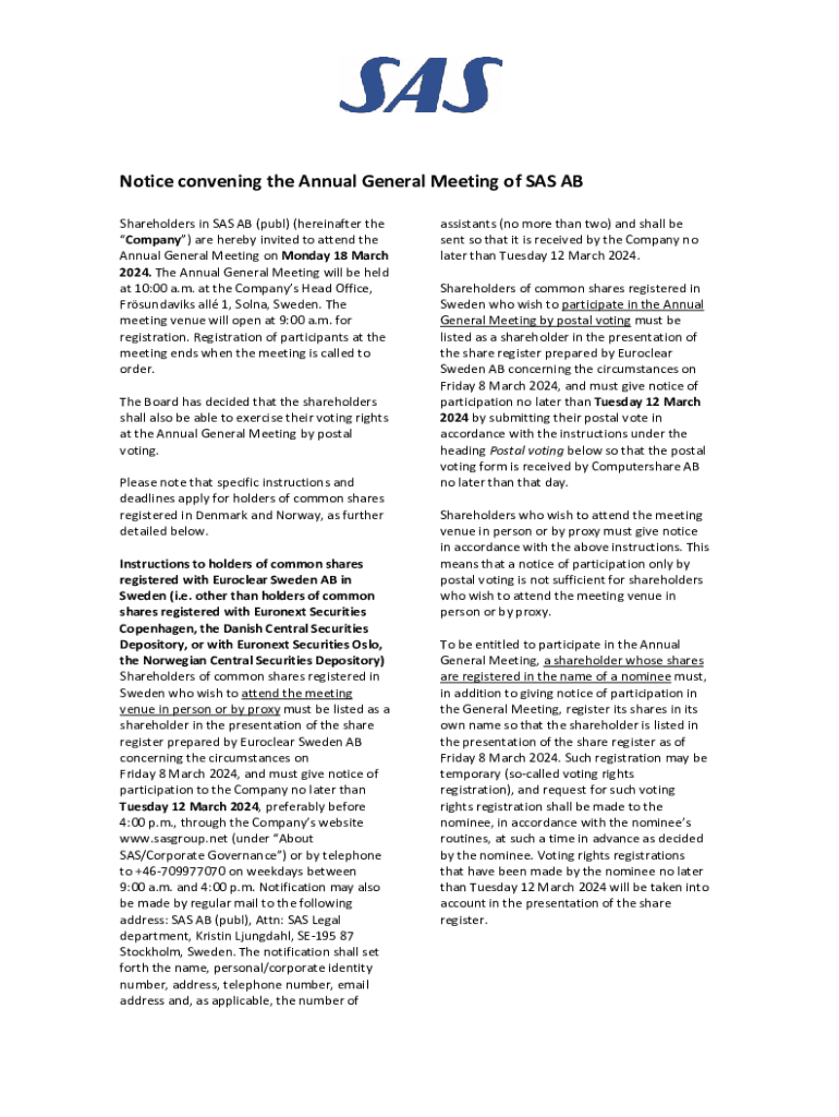 Notice convening the Annual General Meeting of SAS AB Shareholders in SAS AB (publ) (hereinafter the Company) are hereby invited to attend the Annual General Meeting on Monday 18 March 2024. The Annual