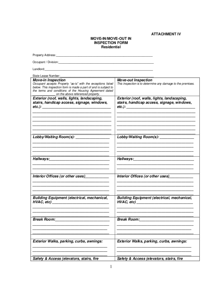 ATTACHMENT IV MOVEIN/MOVEOUT IN INSPECTION FORM Residential Property Address:___ Occupant / Division:___ Landlord:___ State Lease Number:___Movein InspectionMoveout InspectionOccupant accepts Property