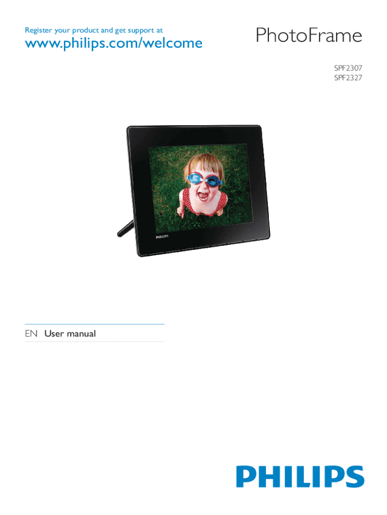 Register your product and get support atwww.philips.com/welcomePhotoFrame SPF2307 SPF2327EN User manual8 SettingsContents 1 Important Safety Notice Banned Substance Declaration Class II statement2