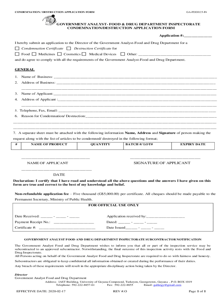 CONDEMNATION / DESTRUCTION APPLICATION FORMGAFDDI125F4GOVERNMENT ANALYST FOOD & DRUG DEPARTMENT INSPECTORATE CONDEMNATION/DESTRUCTION APPLICATION FORM Application #:___ I hereby submit an application