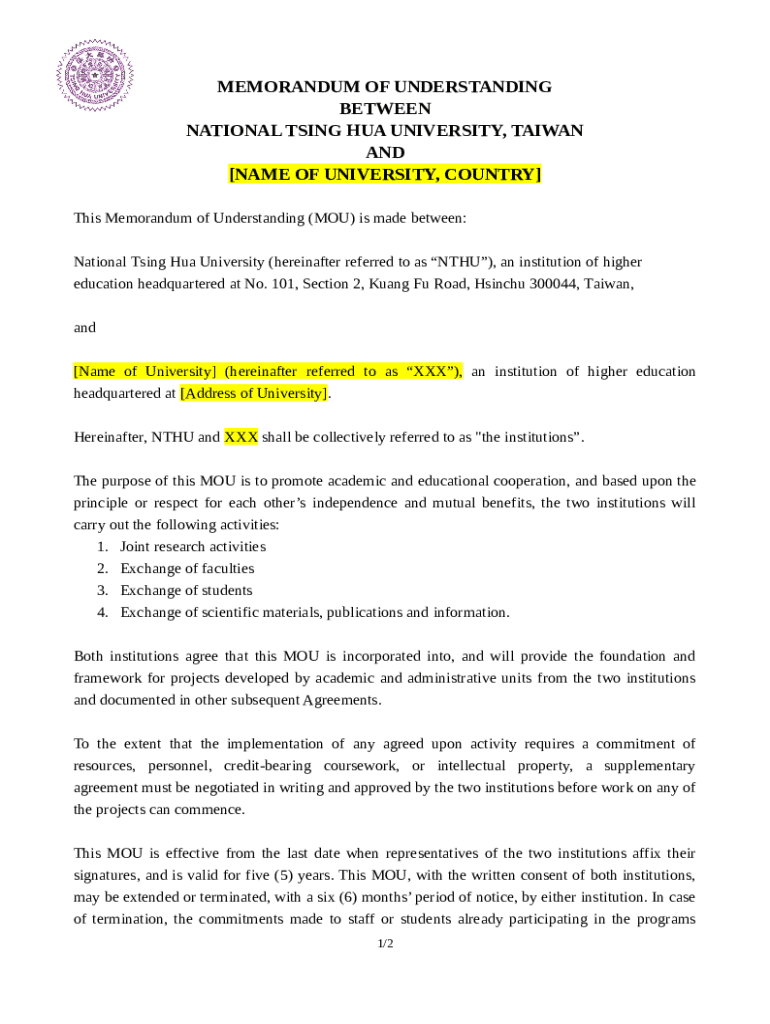 How should you fill out the NTHU Signs Memorandum of Understanding With the ... template