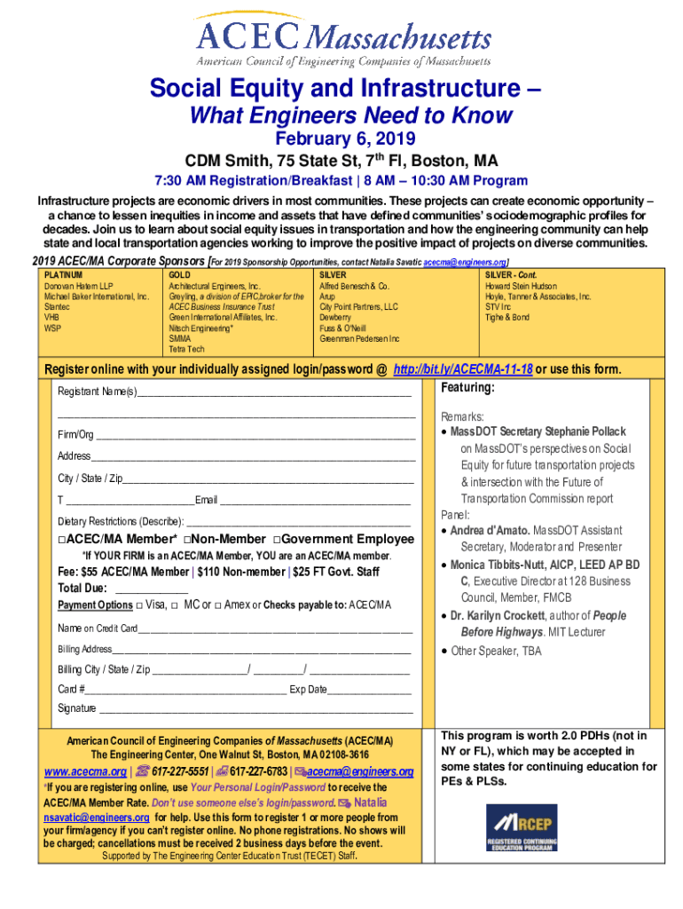 Social Equity and Infrastructure What Engineers Need to Know February 6, 2019, CDM Smith, 75 State St, 7th Fl, Boston, MA 7:30 AM Registration/Breakfast | 8 AM 10:30 AM Program Infrastructure projects