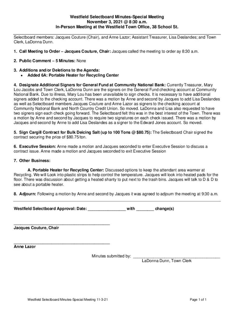 Select board members: Jacques Couture (Chair), and Anne Labor;