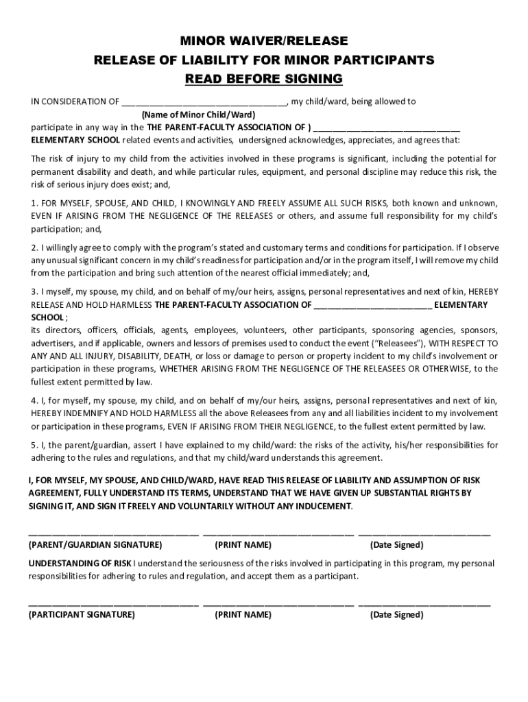 MINOR WAIVER/RELEASE RELEASE OF LIABILITY FOR MINOR PARTICIPANTS READ BEFORE SIGNING IN CONSIDERATION OF ___, my child/ward, being allowed to (Name of Minor Child/Ward) participate in any way in the