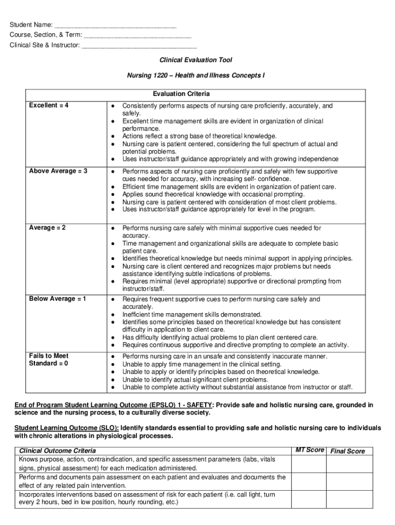 Student Name: ___ Course, Section, & Term: ___ Clinical Site & Instructor: ___ Clinical Evaluation Tool Nursing 1220 Health and Illness Concepts I Evaluation Criteria Excellent 4 Above Average 3 Average