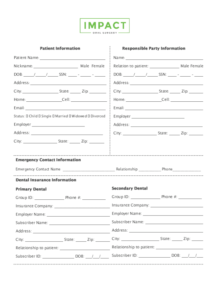 Patient InformationResponsible Party InformationPatient Name: ___Name: ___Nickname: ___ Male FemaleRelation to patient: ___ Male Female DOB: ___/___/___ SSN: ___ ___ ___DOB: ___/___/___ SSN: ___ ___