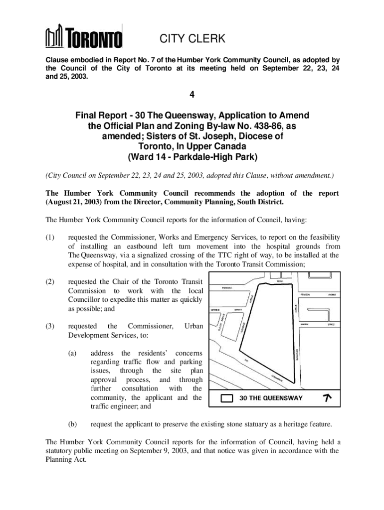 CITY CLERK Clause embodied in Report No. 7 of the Humber York Community Council, as adopted by the Council of the City of Toronto at its meeting held on September 22, 23, 24 and 25, 2003.4 Final Report