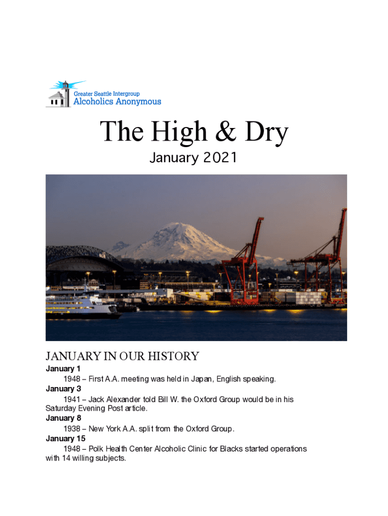 The High & Dry January 2021JANUARY IN OUR HISTORY January 11948 First A.A. meeting was held in Japan, English speaking. January 31941 Jack Alexander told Bill W. the Oxford Group would be in his Saturday