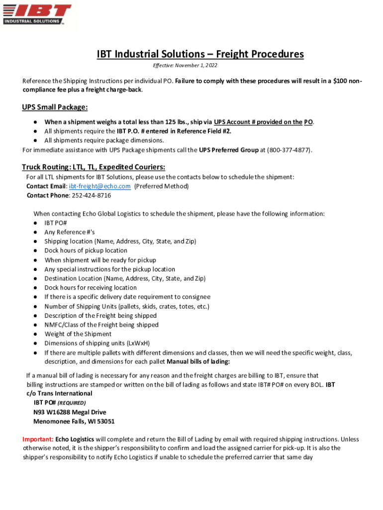 IT Industrial Solutions Freight Procedures Effective: November 1, 2022Reference the Shipping Instructions per individual PO. Failure to comply with these procedures will result in a $100 noncompliance