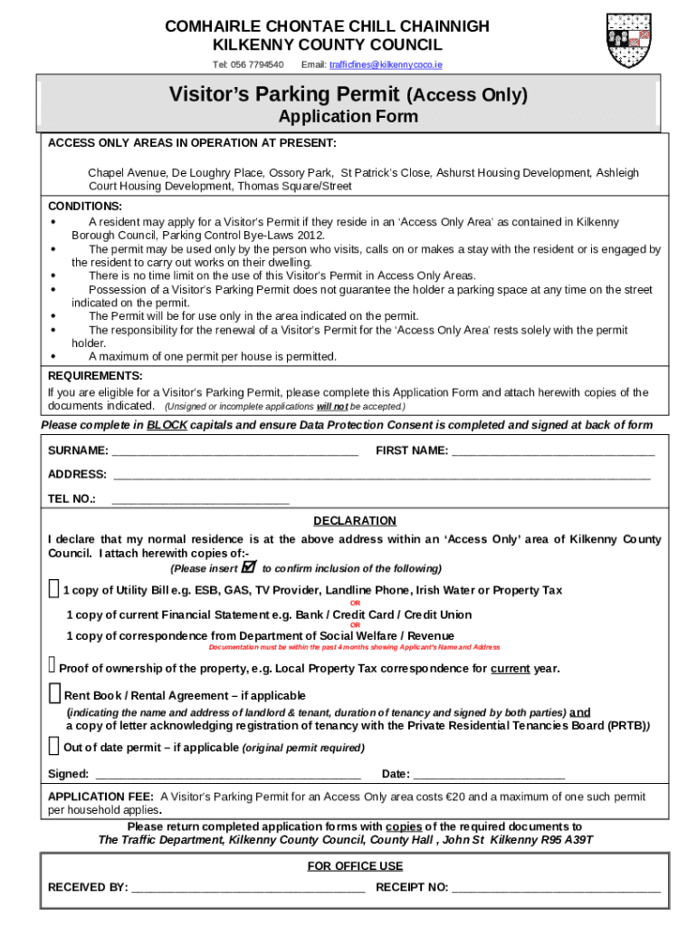 The Visitor's Parking Permit (Access Only) Application is a document needed to be submitted to the required address in order to provide some info. It has to be completed and signed, which can be done in hard copy, or with a certain solution such as PDFfiller. This tool helps to fill out any PDF or Word document directly in your browser, customize it according to your requirements and put a legally-binding electronic signature. Once after completion, you can easily send the Visitor's Parking Permit (Access Only) Application to the relevant individual, or multiple individuals via email or fax. The editable template is printable too due to PDFfiller feature and options presented for printing out adjustment. In both digital and in hard copy, your form will have a organized and professional appearance. You may also turn it into a template for later, without creating a new blank form from scratch. All you need to do is to edit the ready template.