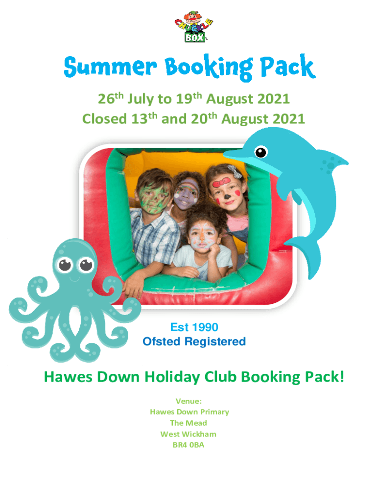 26th July to 19th August 2021 Closed 13th and 20th August 2021Est 1990 Ofsted RegisteredHawes Down Holiday Club Booking Pack! Venue: Hawes Down Primary The Mead West Wickham BR4 0BAHoliday Club Information