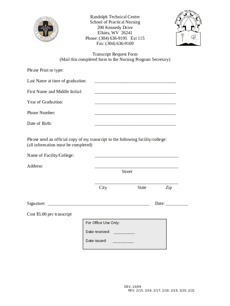What is Randolph Technical Center Transcript RequestElkins, WV - rtc rand k12 wv Form?