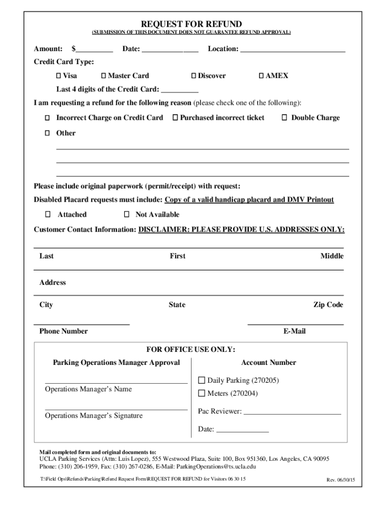 (SUBMISSION OF THIS DOCUMENT DOES NOT GUARANTEE REFUND APPROVAL)Amount:$___Date: ___Location: ___Credit Card Type: