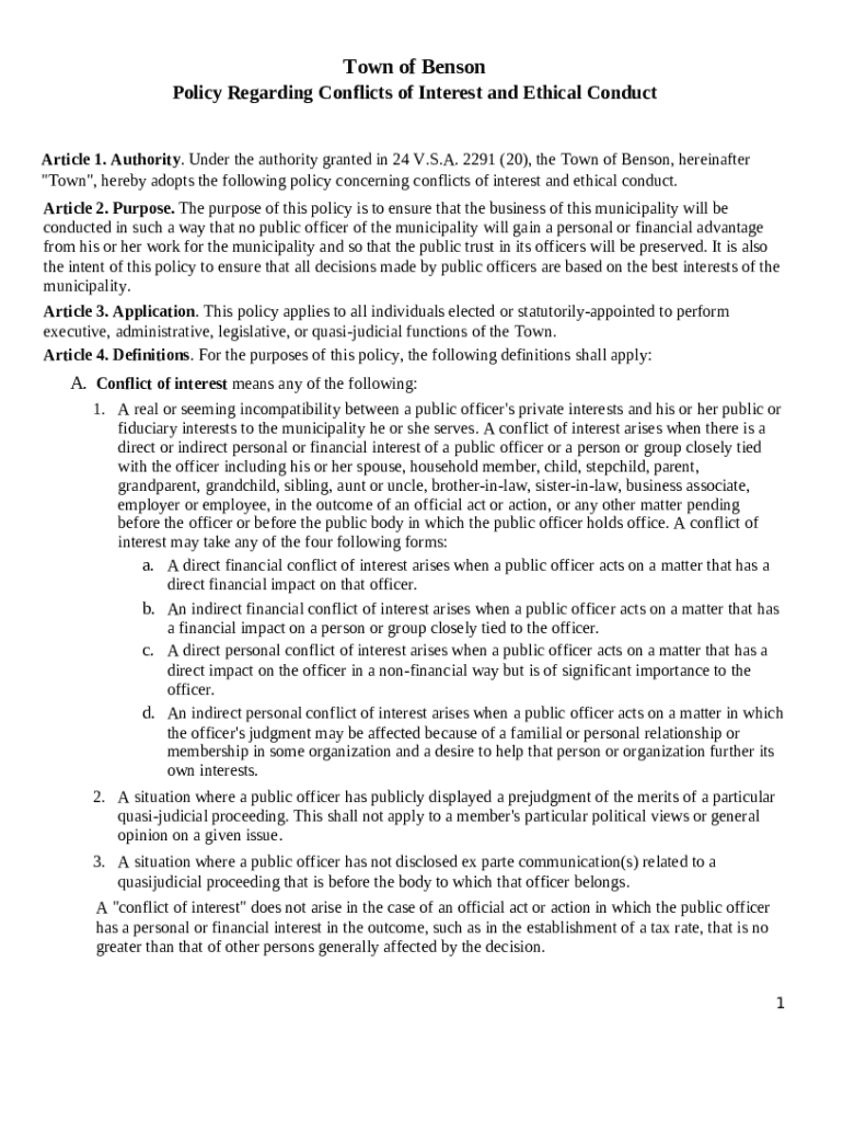 - Find the Town of Benson Policy Regarding Conflicts of Interest and ... form in PDFfiller’s filebase.