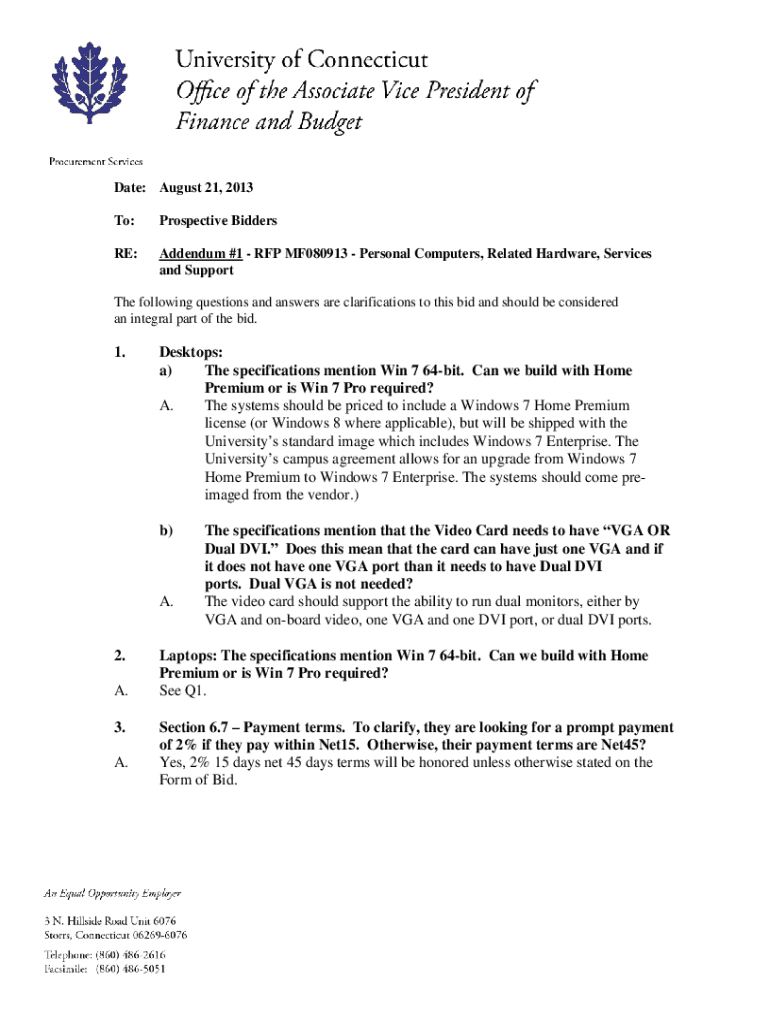 Date: August 21, 2013, To:Prospective Bidders RE:Addendum #1 RFP MF080913 Personal Computers, Related Hardware, Services and Supportive following questions and answers are clarifications to this bid
