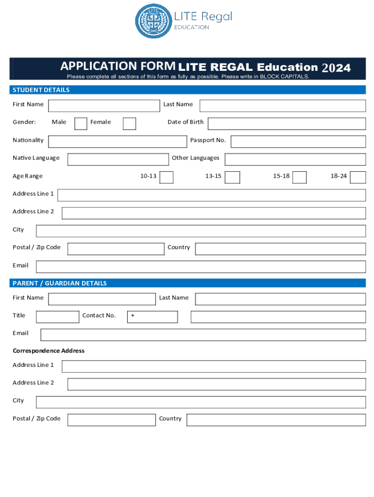 APPLICATION FORM LITE REGAL Education 2024 Please complete all sections of this form as fully as possible. Please write in BLOCK CAPITALS.STUDENT DETAILS First Name Gender:Last Name MaleFemaleDate