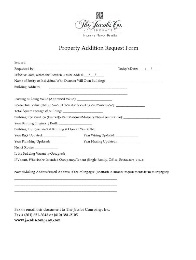 Property Addition Request Form Insured: ___ Requested by: ___Todays Date: ___/___/___Effective Date, which the location is to be added: ___/___/___ Name of Entity or Individual Who Owns or Will Own