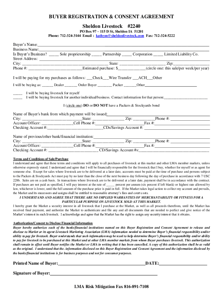 BUYER REGISTRATION & CONSENT AGREEMENT Sheldon Livestock #2240 PO Box 97 115 D St, Sheldon IA 51201 Phone: 7123243144 Email : kathym@sheldonlivestock.com Fax: 7123245222Buyers Name: ___ Business Name: