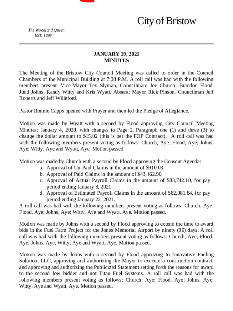 The Vice-Mayor Tex Slyman, Councilman: Joe Church, Brandon Flood, Judd Johns, Randy Witty and Kris Wyatt is a document which can be filled-out and signed for specified purposes. In that case, it is furnished to the exact addressee to provide some details and data. The completion and signing is able manually or using a suitable application e. g. PDFfiller. Such tools help to fill out any PDF or Word file without printing out. It also allows you to edit its appearance according to your requirements and put a legal electronic signature. Once finished, the user ought to send the Vice-Mayor Tex Slyman, Councilman: Joe Church, Brandon Flood, Judd Johns, Randy Witty and Kris Wyatt to the recipient or several recipients by email and even fax. PDFfiller provides a feature and options that make your Word template printable. It offers a variety of settings when printing out appearance. It does no matter how you file a form - physically or by email - it will always look professional and firm. In order not to create a new editable template from the beginning over and over, turn the original file into a template. After that, you will have a rewritable sample.