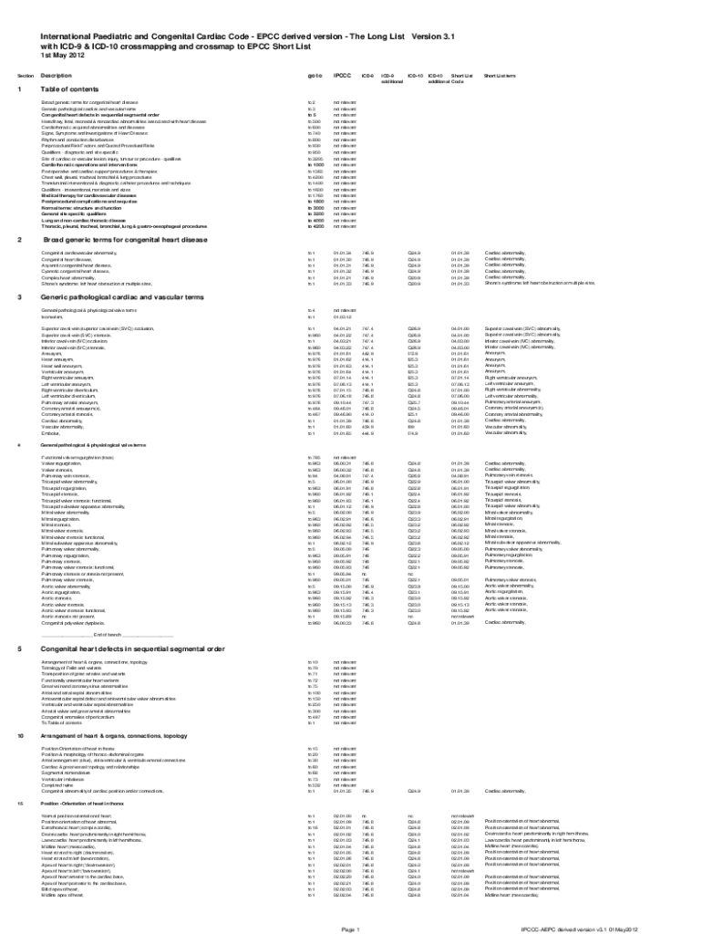 International Paediatric and Congenital Cardiac Code EPCC derived version The Long List Version 3.1 with ICD9 & ICD10 crossmapping and crossmap to EPCC Short List 1st May 2012 SectionDescription1Table