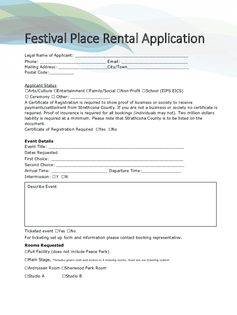 Festival Place Rental Application Legal Name of Applicant: ___ Phone: ___ Email: ___ Mailing Address: ___City/Town___ Postal Code:___ Applicant Status Arts/Culture Entertainment Family/Social NonProfit