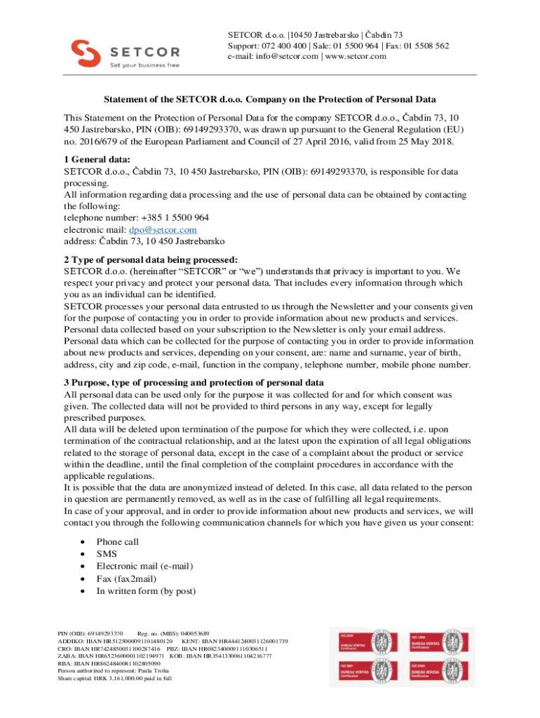 SETCOR d.o.o. |10450 Jastrebarsko | abdin 73 Support: 072 400 400 | Sale: 01 5500 964 | Fax: 01 5508 562 email: info@setcor.com | www.setcor.comStatement of the SETCOR d.o.o. Company on the Protection