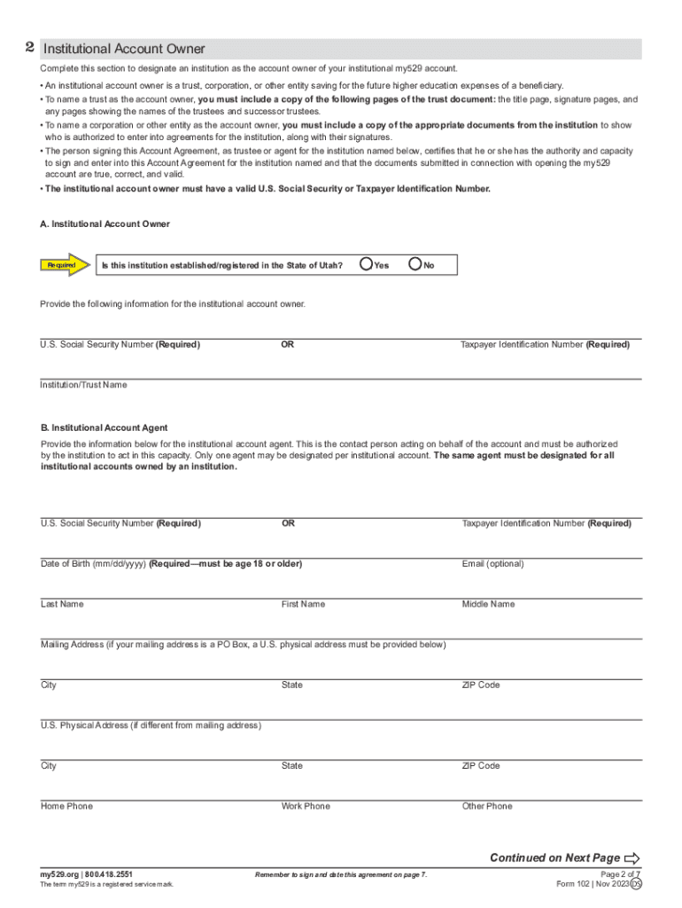 After printing the completed form, close your browser to protect your personal information.Clear formFor my529 Use Onlymy529 AccountDate Received/InitialsDate Processed/InitialsForm 102 Institutional