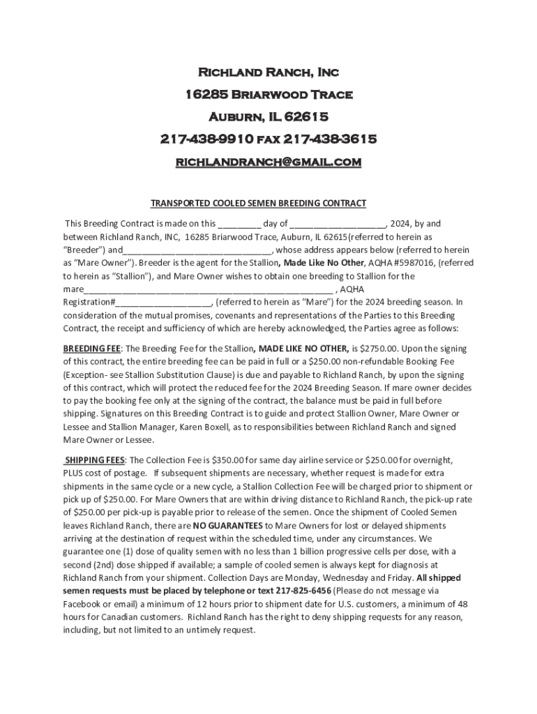Richland Ranch, Inc 16285 Briarwood Trace Auburn, IL 62615 2174389910 fax 2174383615 richlandranch@gmail.com TRANSPORTED COOLED SEMEN BREEDING CONTRACT This Breeding Contract is made on this ___ day