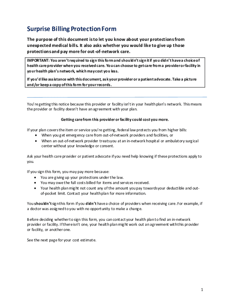 Surprise Billing Protection Form The purpose of this document is to let you know about your protections from unexpected medical bills. It also asks whether you would like to give up those protections