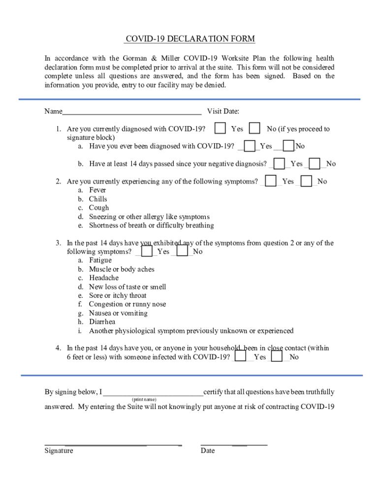 COVID19 DECLARATION FORM In accordance with the Gorman & Miller COVID19 Worksite Plan the following health declaration form must be completed prior to arrival at the suite. This form will not be considered