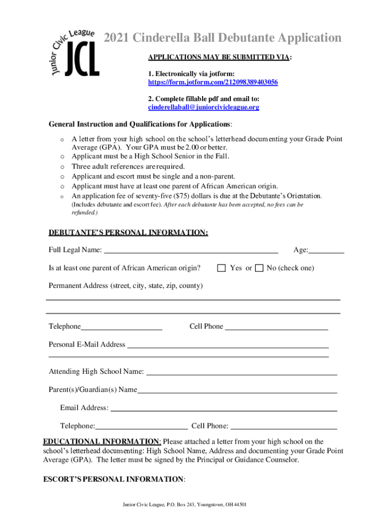2021 Cinderella Ball Debutante Application APPLICATIONS MAY BE SUBMITTED VIA: 1. Electronically via jotform: https://form.jotform.com/212098389403056 2. Complete fillable pdf and email to: cinderellaball@juniorcivicleague.orgGeneral