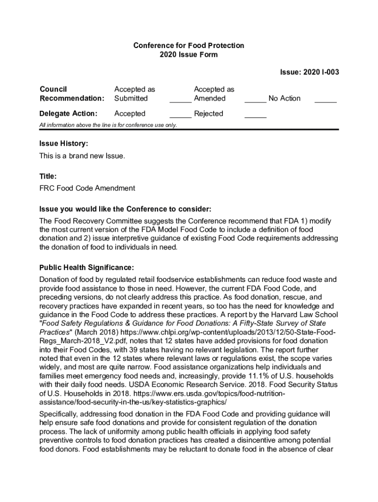Conference for Food Protection 2020 Issue Form Issue: 2020 I003 Council Recommendation:Accepted as SubmittedAccepted as AmendedDelegate Action:AcceptedRejectedNo ActionAll information above the line