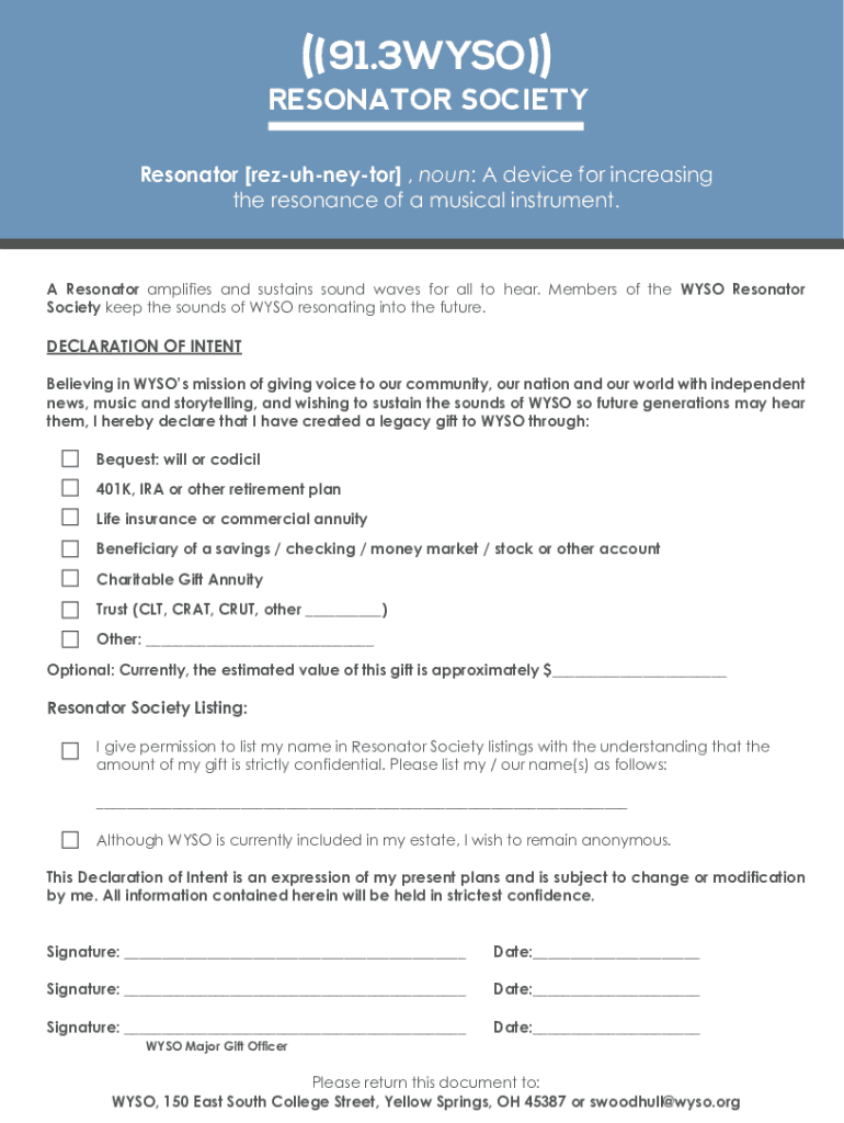 RESONATOR SOCIETY Resonator [rezuhneytor] , noun: A device for increasing the resonance of a musical instrument.A Resonator amplifies and sustains sound waves for all to hear. Members of the WYSO